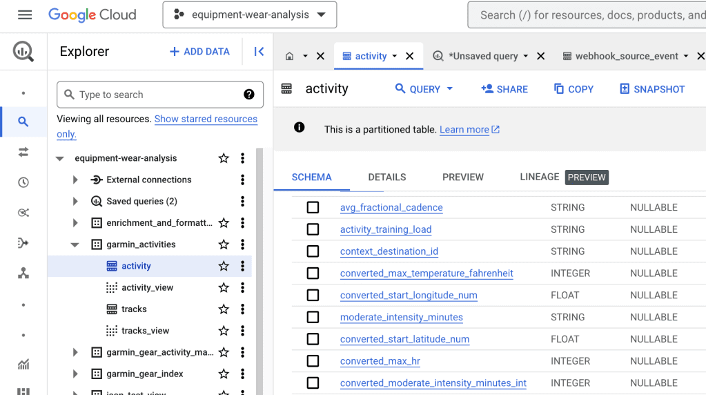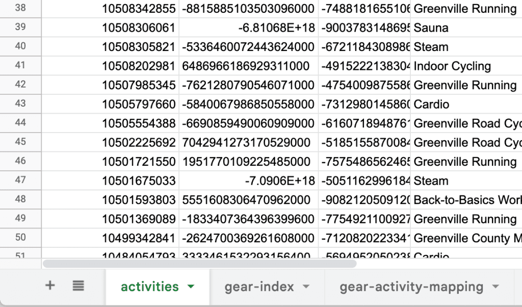 The final result is a set of three tabs in the Google Sheet that are ready to be pulled into BigQuery. I named them activities, gear-index, and gear-activity-mapping.