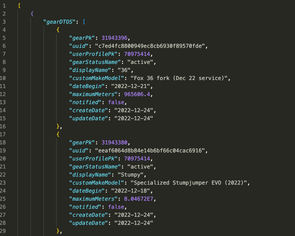 Next, I tried to export the tabular data from Garmin's Activity list interface (in their Garmin Connect web app), but the exports are limited summaries and don't include gear, which was necessary for the project, or other details like latitude and longitude.
