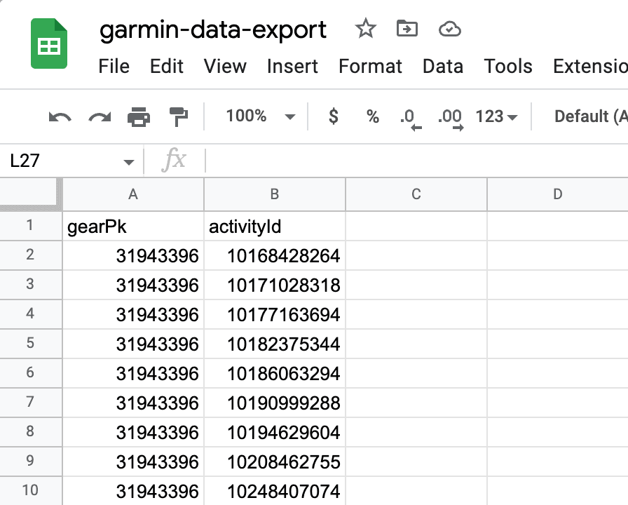 Second, I removed the object hierarch from the gear/activity mapping in order to have a clean, simple list of mapped IDs, which I converted to CSV and loaded into a separate tab in the Google Sheet.