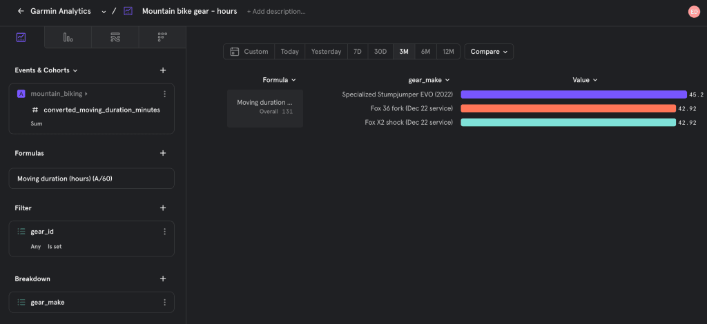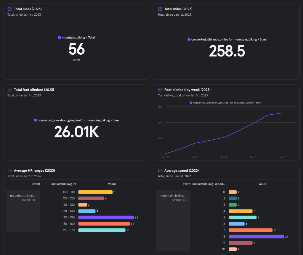 Event-based product analytics tools like Mixpanel and Amplitude are purpose-built for event analytics. As a daily user of Mixpanel in my work, I was also excited by the idea of analyzing my mountain biking activity data in a familiar analytics platform.