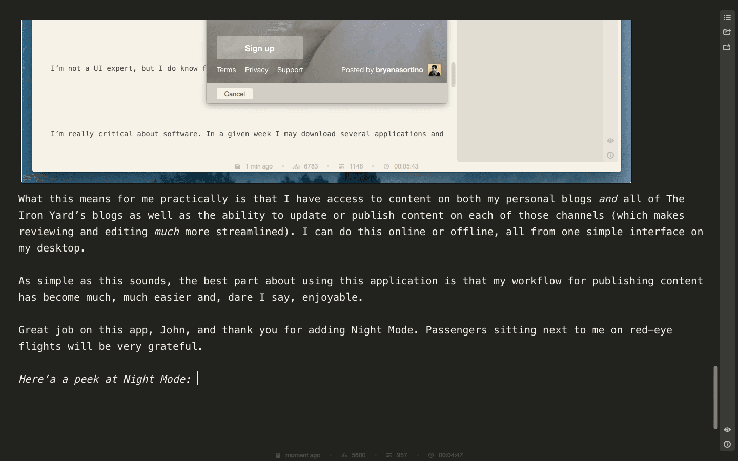 From the outset, I knew I was going to like the product because the app got out of the way. There was a distinct lack of friction—the app felt ‘light,’ almost too-simple. That’s because many of the features are under the hood (and not visibly accessible when you’re actually creating content). Even when the publishing engine was broken (and I couldn’t post content through the app) I found myself using it to write because, well, it was enjoyable to use.
