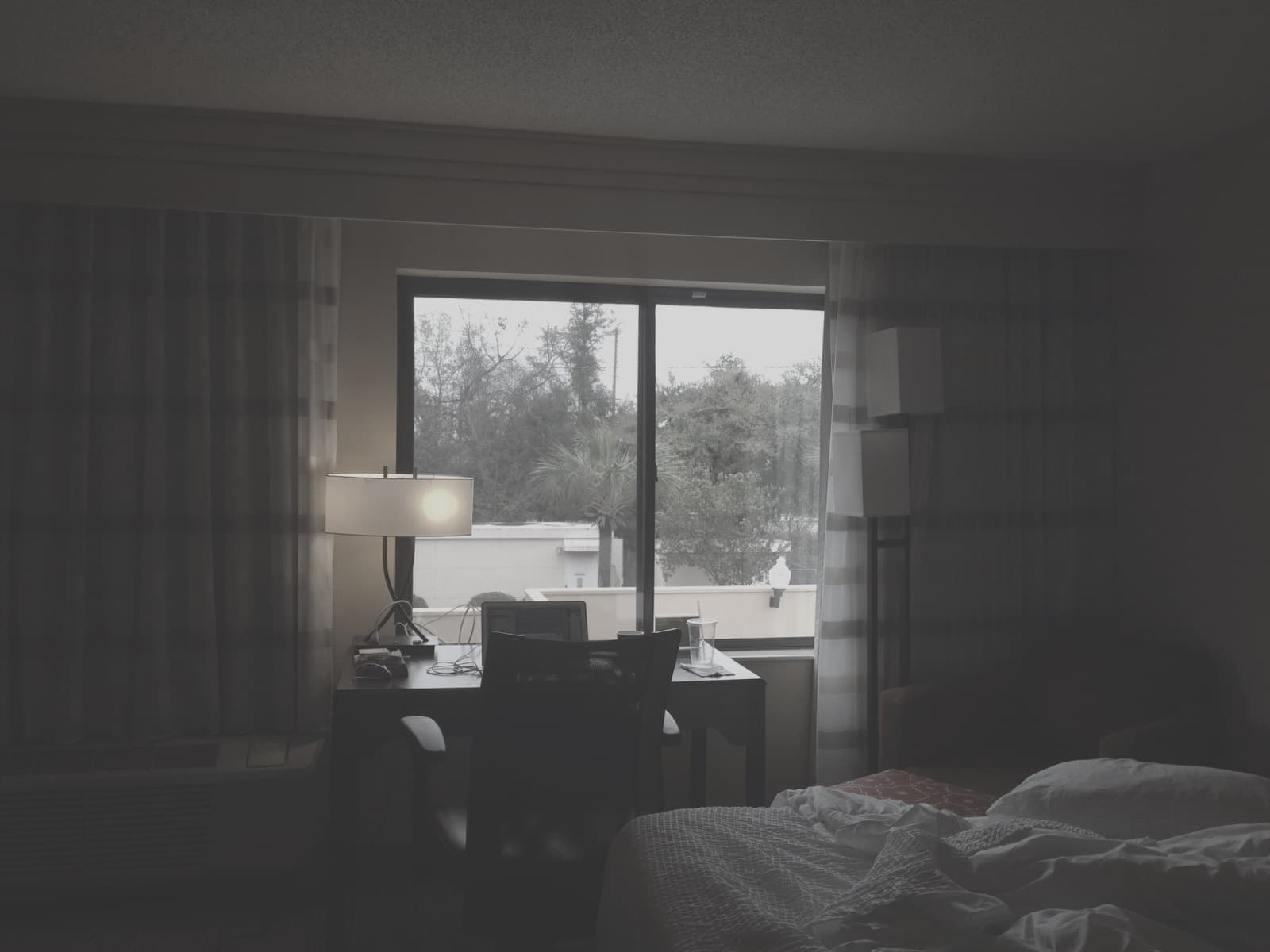 Today I had several hours of work to do in a hotel room, so I dragged the desk to the window for sunlight and at least some sort of view (other than beige walls).